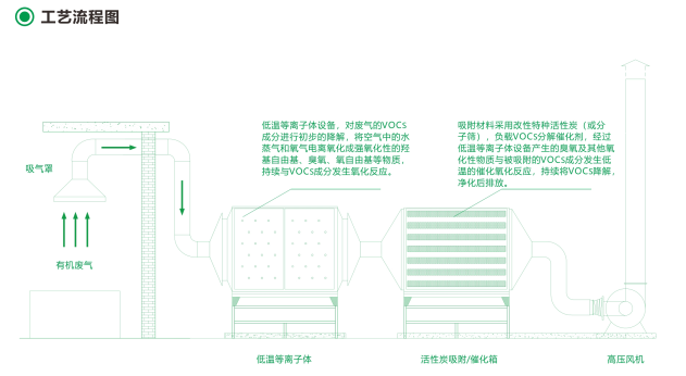 有機(jī)廢氣經(jīng)過排風(fēng)設(shè)備,輸入等離子體凈化設(shè)備,在設(shè)備內(nèi)經(jīng)過電離、氧化反應(yīng)過程,使有機(jī)物成分被降解成小分子無機(jī)化合物,H?O和CO?,凈化后排空。廢氣中如有水蒸氣成分,或濕度較大,會(huì)適當(dāng)增強(qiáng)凈化效果。廢氣中如含有顆粒物,則可能被等離子體設(shè)備收集,降低設(shè)備凈化效果。因此處理含顆粒物的有機(jī)廢氣時(shí),需要定期開機(jī)檢查設(shè)備被污染的情況,以保障設(shè)備正常運(yùn)行。