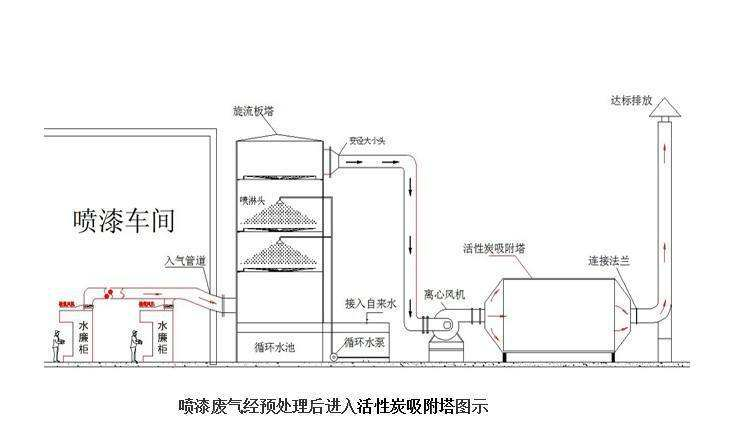 廢氣經(jīng)過吸附塔內(nèi)的初效過濾器除去固體顆粒物后,進(jìn)入塔體,經(jīng)過活性炭層吸附后,除去氣體中的有機(jī)廢氣分子,達(dá)到符合排放標(biāo)準(zhǔn)的凈化氣體,經(jīng)風(fēng)機(jī)排到室外。