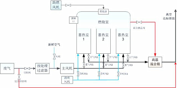 有機廢氣通過風(fēng)機輸入蓄熱室進行升溫,吸收儲存的熱量,隨后進入焚燒室進行燃燒,在燃燒的過程中,有機廢氣被分解成二氧化碳和水。而且,有機廢氣在燃燒的時候,所釋放的能量,還可以被蓄熱室里的廢氣利用,達(dá)到節(jié)能的目的。
