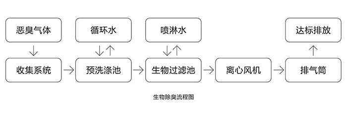 惡臭氣體經(jīng)過管道收集后進(jìn)入生物過濾除臭裝置,氣流與循環(huán)液在穿過生物填料層的過程中完成生物的氣液擴(kuò)散、液固擴(kuò)散、生物氧化三個(gè)過程,生物填料表面生物膜中的微生物以惡臭氣體物質(zhì)為營(yíng)養(yǎng),惡臭物及VOCs被微生物氧化分解,在轉(zhuǎn)化過程中產(chǎn)生能量,為微生物的生長(zhǎng)與繁殖提供能源,使惡臭氣體物質(zhì)的轉(zhuǎn)化持續(xù)進(jìn)行,經(jīng)凈化后的氣體由引風(fēng)機(jī)引出排放。